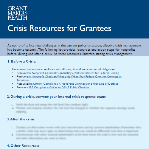 As non-profits face new challenges in the current policy landscape, effective crisis management has become essential. This Grantmakers In Health toolkit provides resources and action steps for grantee nonprofits before, during, and after a crisis.
